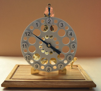 "This design was created to answer the question, 'is it possible to make a mechanical pendulum clock with a rotating face?'. The going train is from Colin J Thorne's Skeleton Timepiece, with a motion work running up the front plate to power the face and a separate motion work for the minute hand to compensate for the movement of the face. Each of the numeral 'discs' is mounted on an offset pin in a bearing so that the numbers remain readable when the face rotates, as at any time other than 12 o'clock, it's quite hard to read."